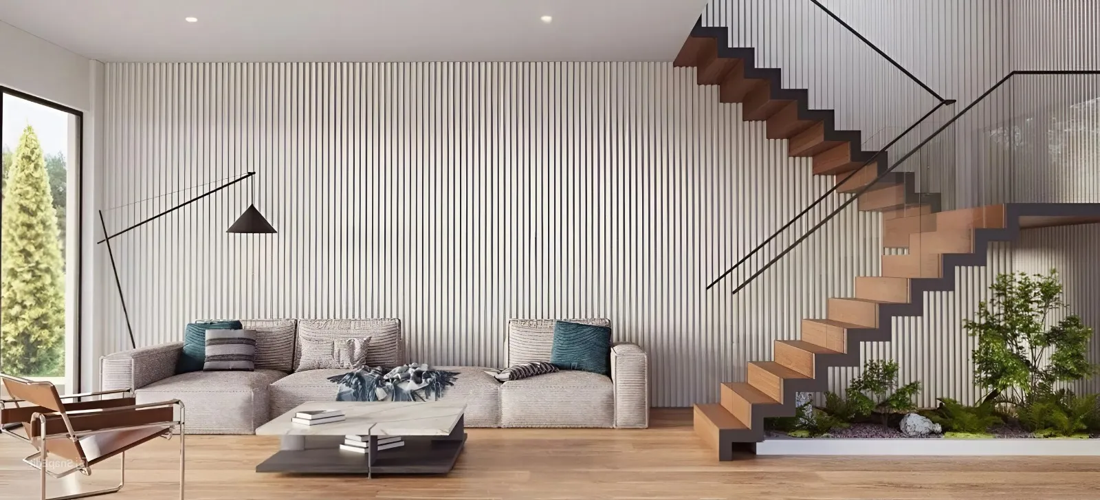 1. Выполним отделку вашей П-образной лестницы натуральным деревом. Преобразим любую конструкцию, сделав ее центральным элементом вашего интерьера.